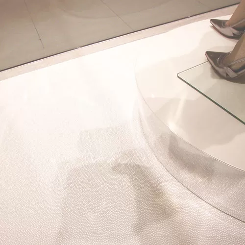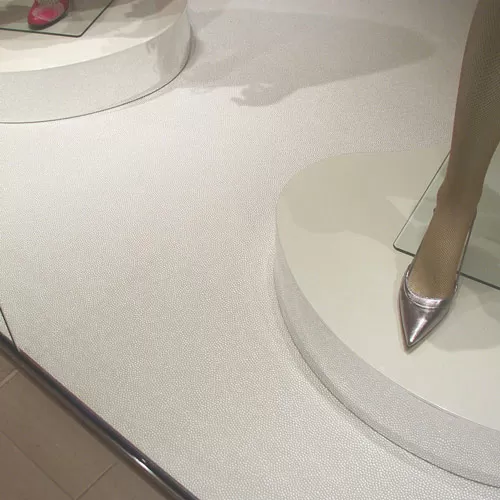 For other locations, such as a school library, a museum, or a church, this type of pearl vinyl flooring can be part of a design that promotes a feeling of peacefulness and serenity. The tiny embossed beads on the surface of the vinyl almost resemble bath beads or a cloud in this type of setting.