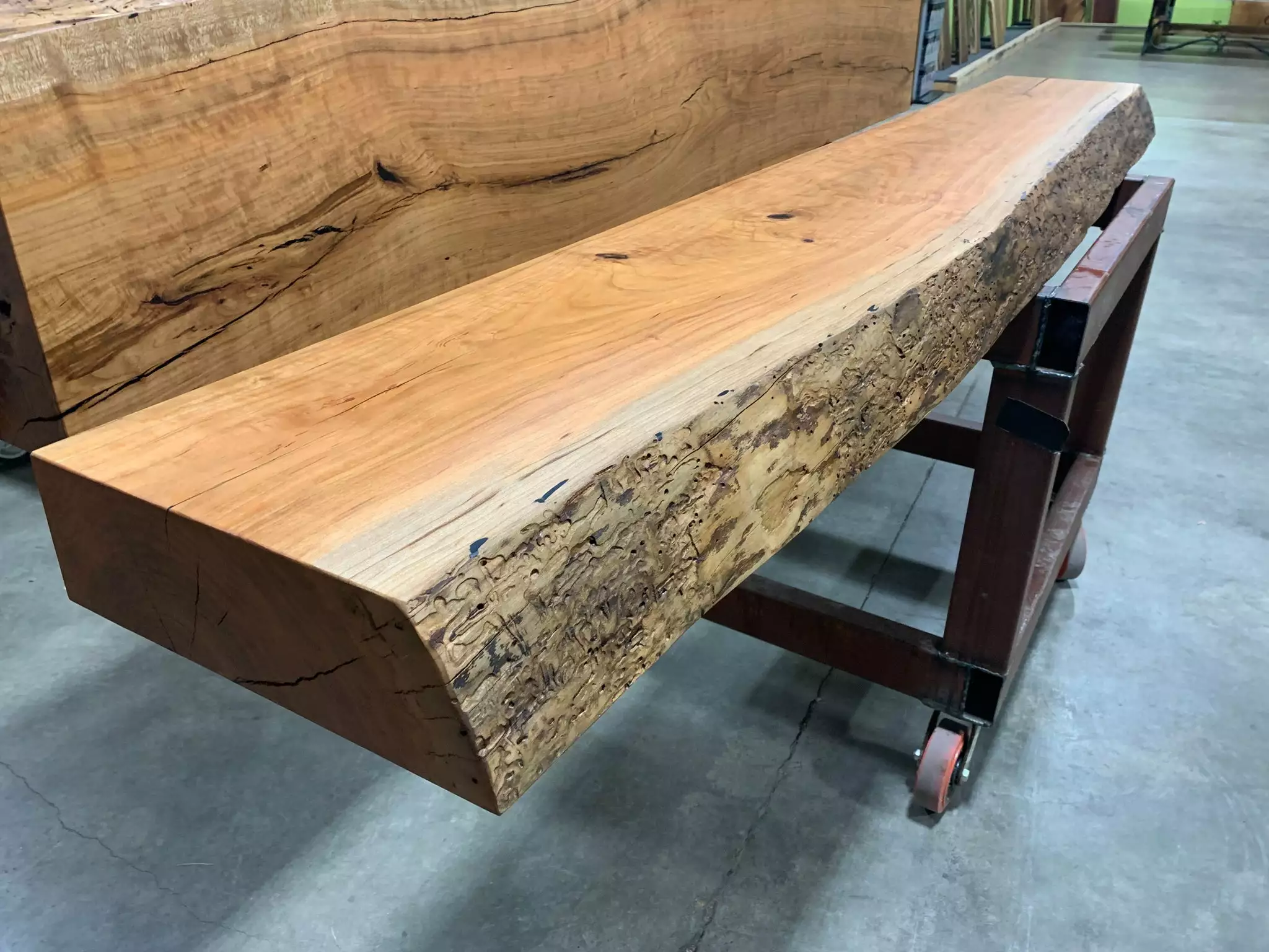 The unique light and dark patterns on the live edge give the cherry mantel the ability to blend well with other wood tones.