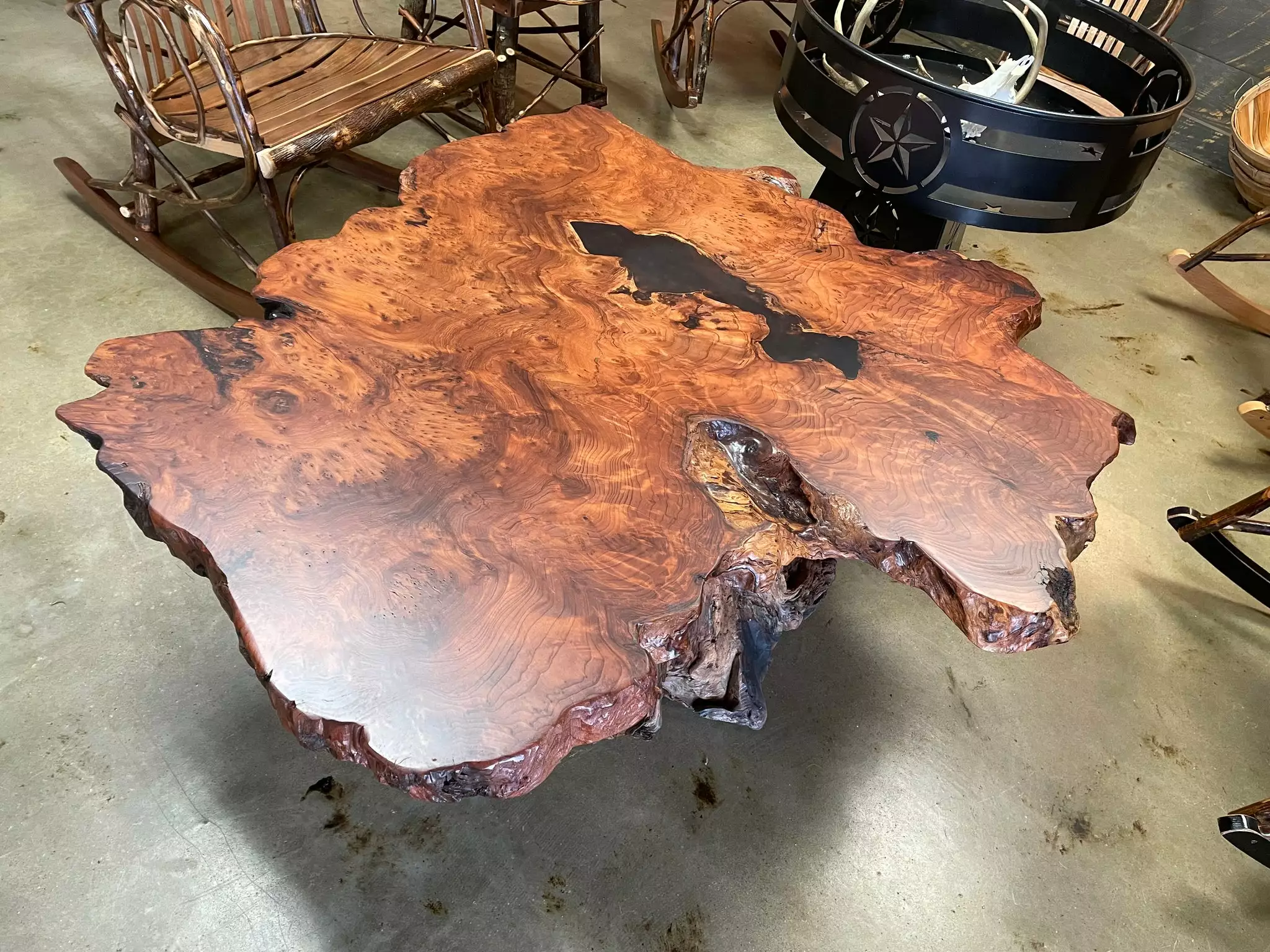 This beautiful immense, ancient, stately, mysterious, powerful Redwood coffee table speaks for itself, not in words, but rather in a soft-toned voice of patience and endurance.