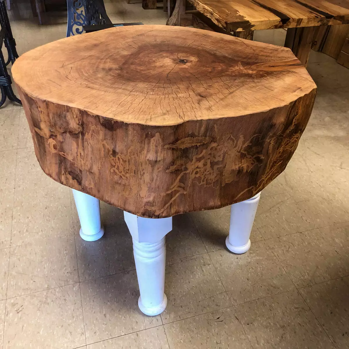 A cross cut sycamore tree stump made into a butcher block with turned and painted wood legs great for that rustic cabin look or in historical architectural sites.