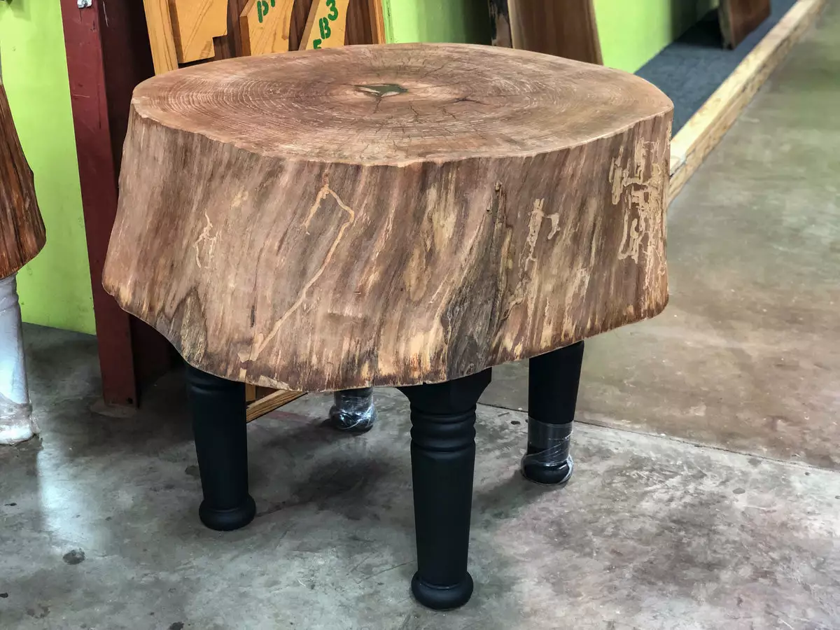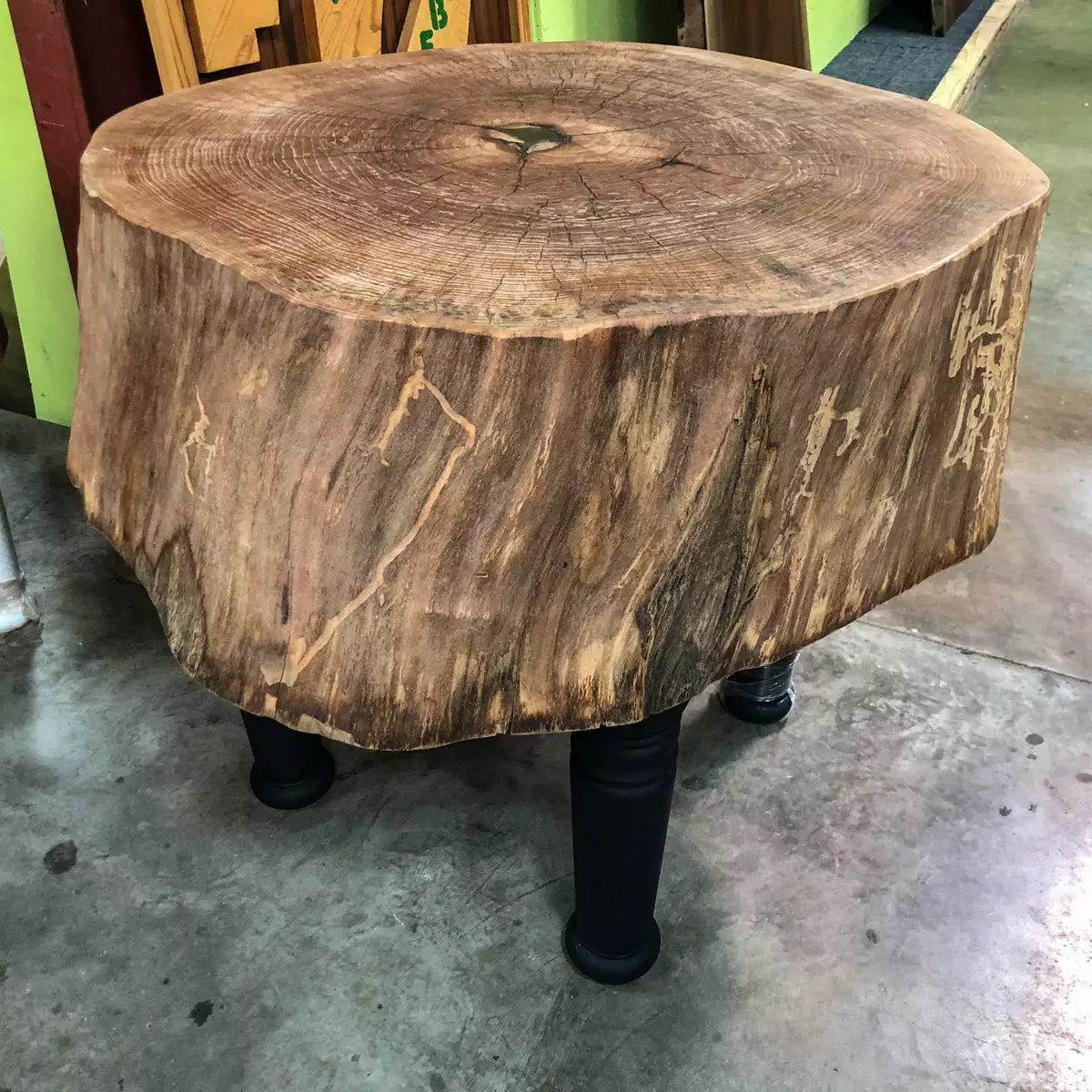 A cross cut sycamore tree stump made into a butcher block with turned and painted wood legs great for that rustic cabin look or in historical architectural sites.