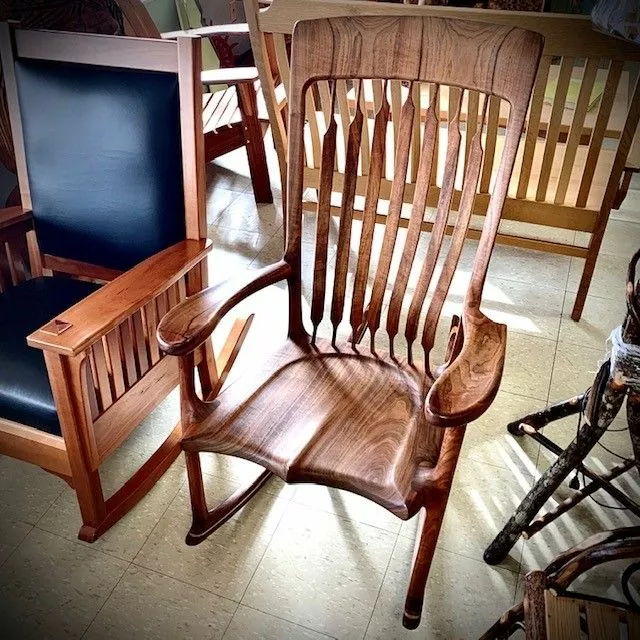 This is a Sam Maloof style Walnut rocking chair with contour back support.