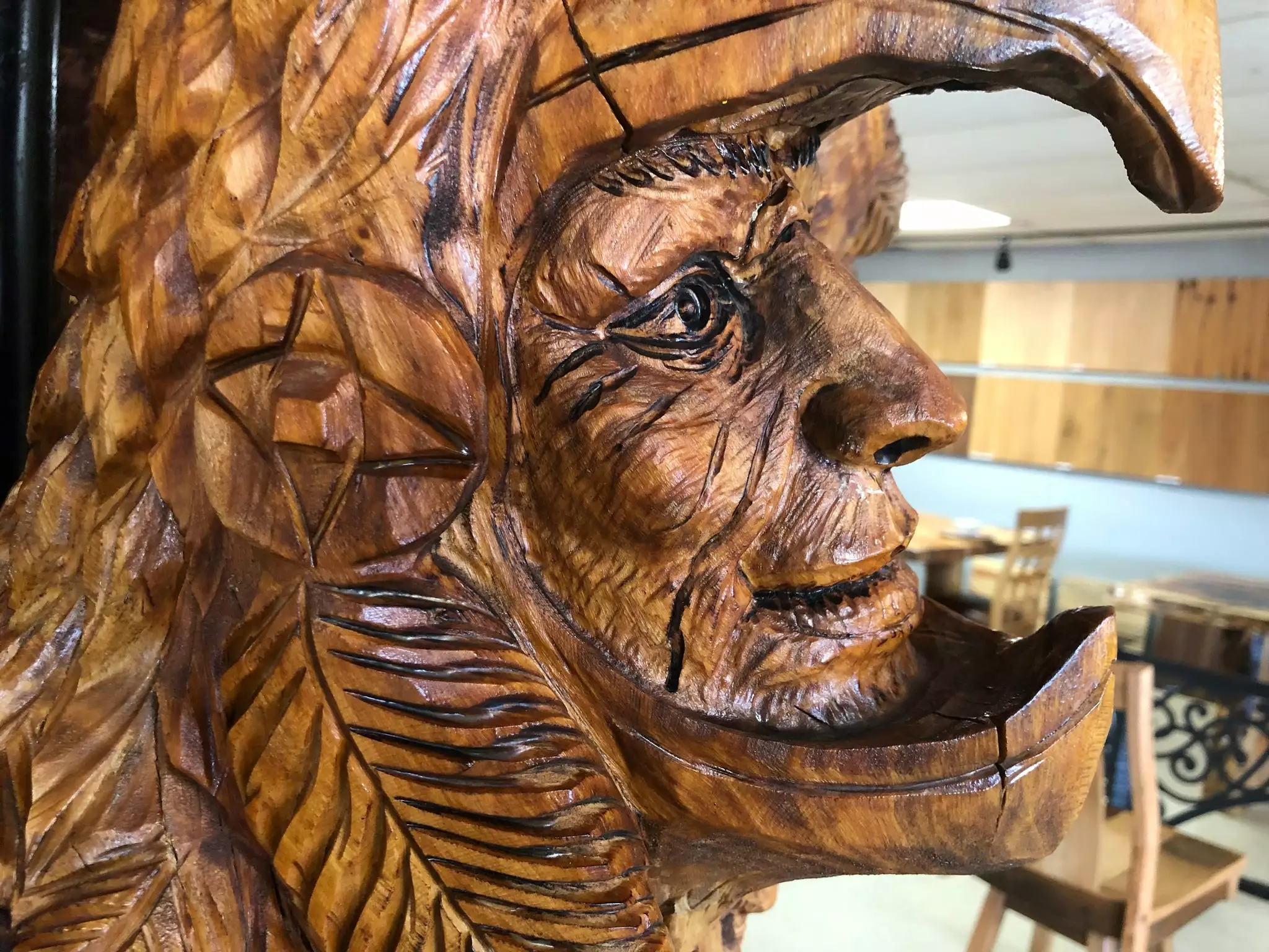 A beautiful hand carved eastern Cedar wooden Indian with feathers and an Eagle on his head.